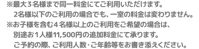 ※最大3名様まで同一料金にてご利用いただけます。2名様以下のご利用の場合でも、一室の料金は変わりません。※お子様を含む4名様以上のご利用をご希望の場合は、別途お1人様11,500円の追加料金にて承ります。ご予約の際、ご利用人数・ご年齢等をお書き添えください。※なお、9月30日ご宿泊分までの追加料金はお1 人様11,000円にて承ります。