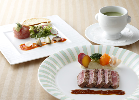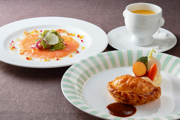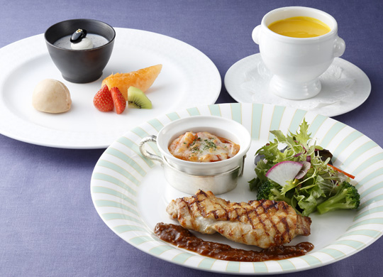 洋食シェフおすすめの2つのメインを一度に味わえるお得なランチコース。1月は爽やかなトマトソースのシーフードグラタンと、神戸マスタードのソースが柔らかな淡路どりの旨味を引き立てるグリルをご用意いたします。