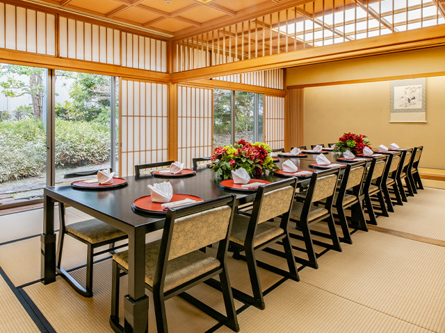 暖かな日が差し込む日本料理 山里のお席はもちろん、離れ座敷で落ち着いた雰囲気の個室もございます。季節の移ろいを感じる日本庭園を眺めながら、季節の味覚を贅沢に盛り込んだお料理をお楽しみいただけます。