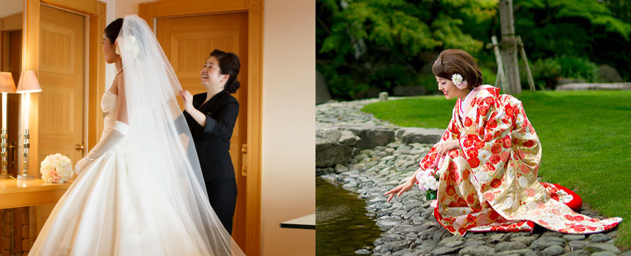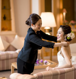 ロイヤルスイートルームをブライズルームとしてご利用いただけます。〈資生堂美容室〉がヘアメイク・着付けを担当。当日はそのままご宿泊いただけ、朝食もご用意いたします。